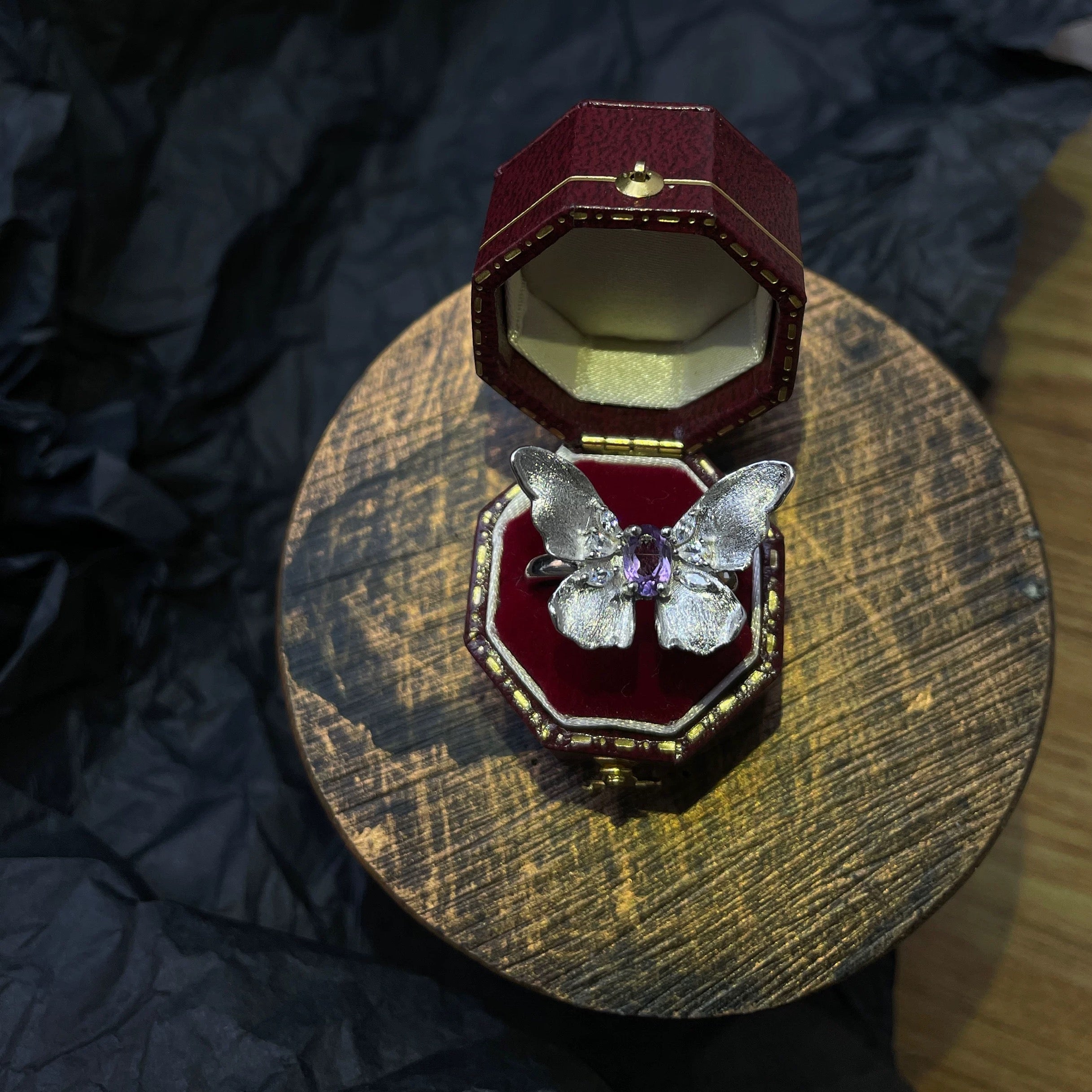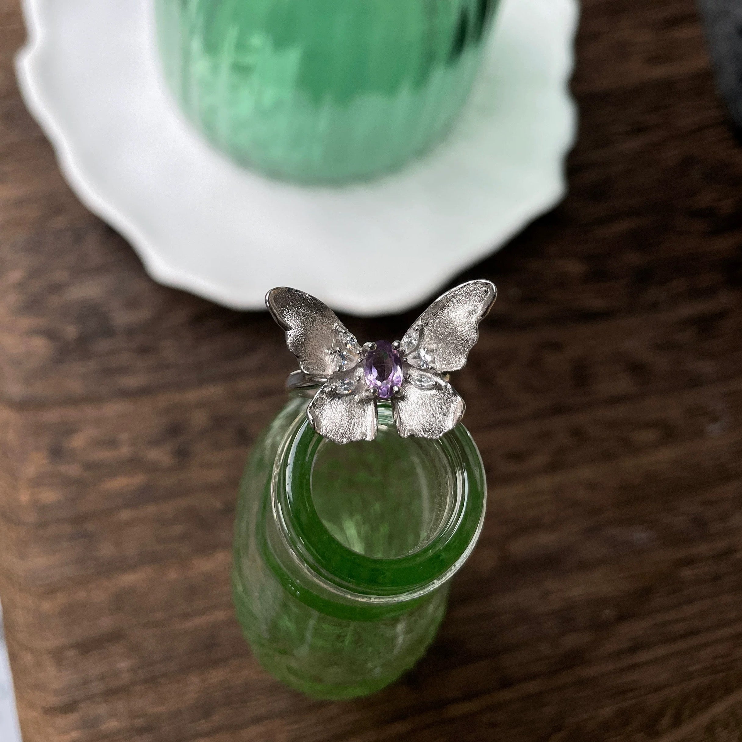 Moonooze S925 Natural Amethyst Charm Retro Index Finger Butterfly Ring